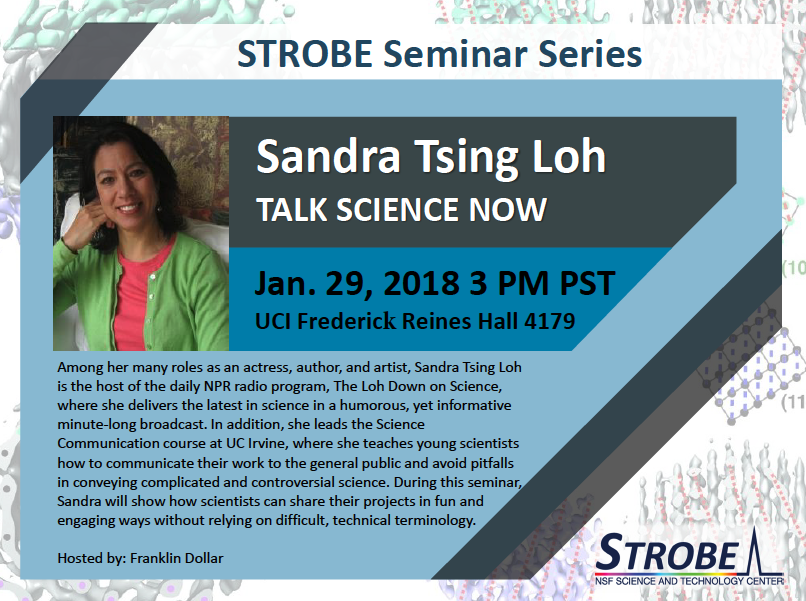 Plasma Physics SeminarSpeaker: Sandra Tsing LohDate: Monday, January 29, 2018Time: 3:00 pmLocation: FRH 4179 Host: Franklin DollarAttachments: STROBEREV.png
